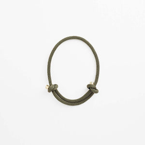 • Braided rope finished with brass caps. This is an adjustable neckpiece.