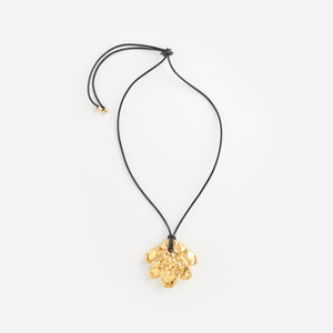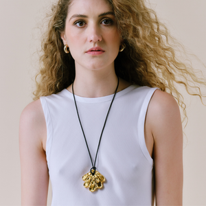 • Gold lustre ceramic pendant, handcrafted by Lucie de Moyencourt, on a leather cord with brass caps.