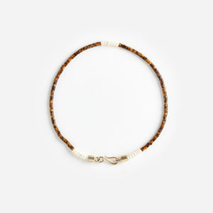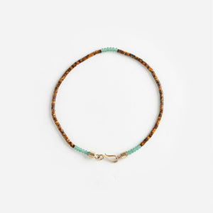 Combinations of aquamarine, coral, tigers eye and pearl beads assembled together and closed with a brass clasp.